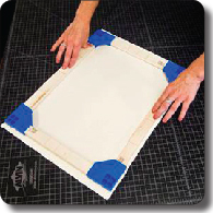 STEP 11. Snap a corner brace into each corner. The corner braces pop into pre-cut grooves in the stretcher bars and keep the finished wrap perfectly square.